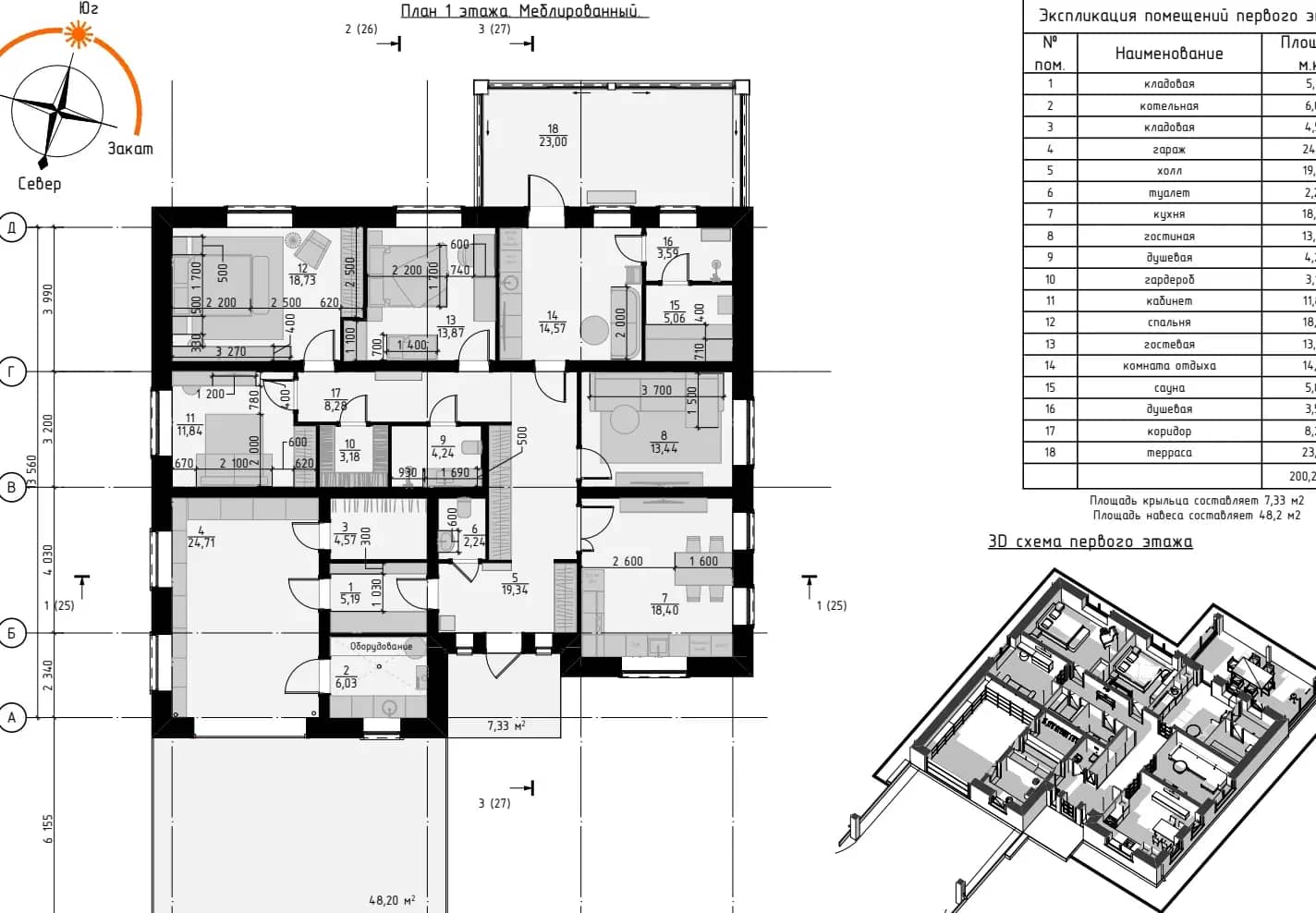 Площадь: 200 м² — 3 спальни, кабинет, кухня гостинная, 2 ванных, котельная, террасса, 2 гардеробных, балкон