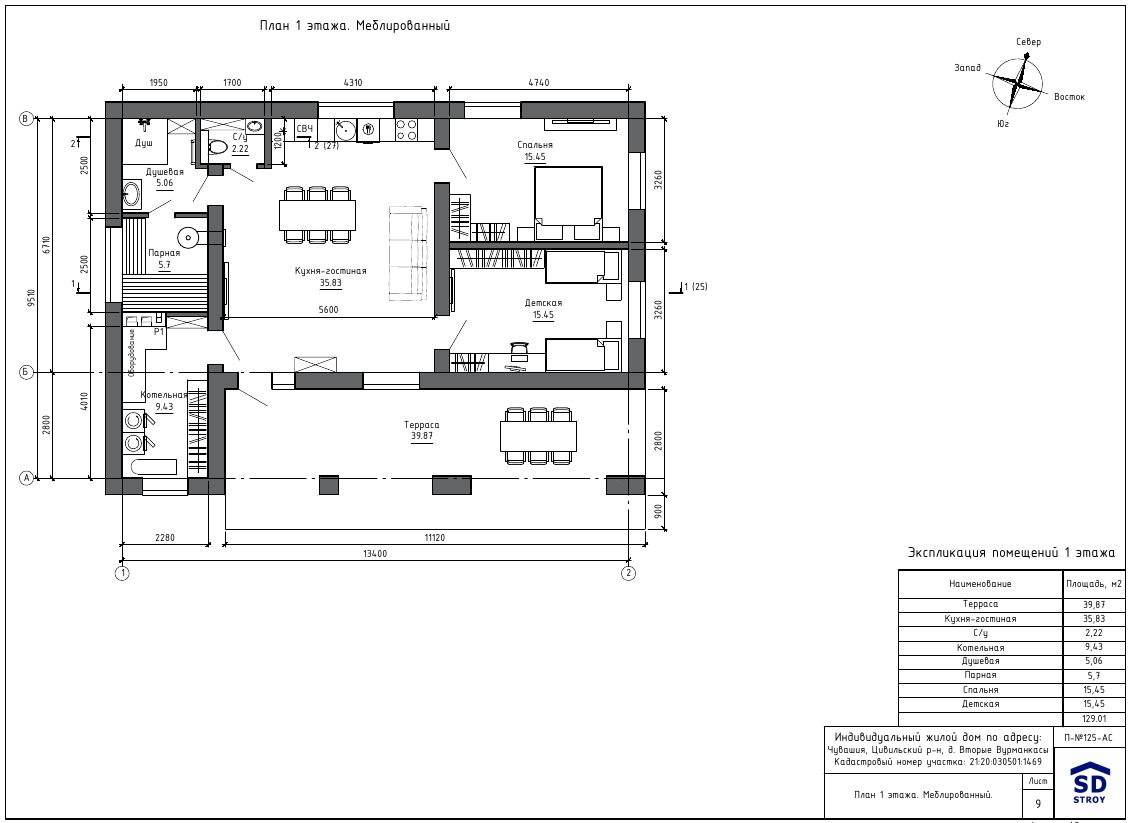 Площадь: 129 м² — 2 спальни, котельная, с.у. , кухня-гостинная, парная